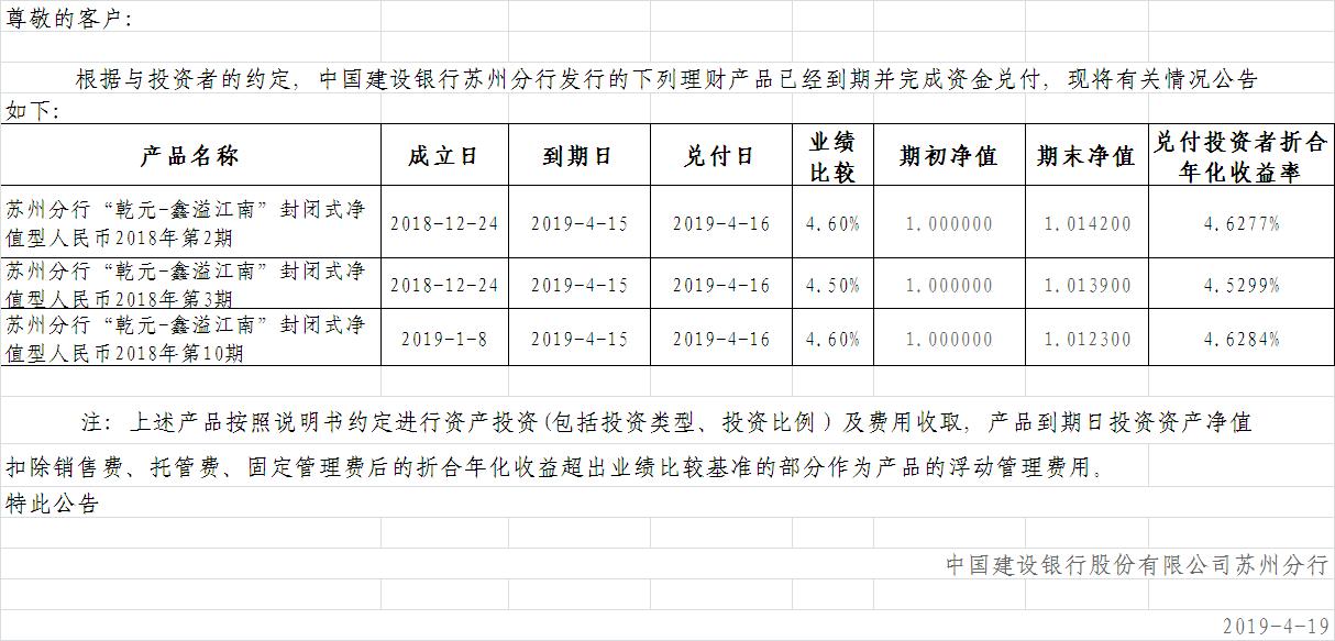 苏州分行“乾元-鑫溢江南”封闭式净值型人民币理财产品2018年第2期等三期终止公告